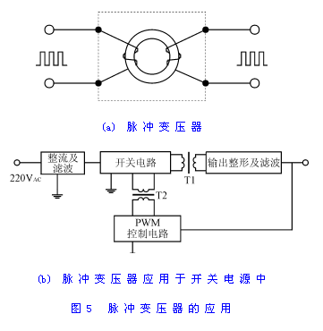 脈沖變壓器的匝數(shù)較少,而且一次繞組和二次繞組分別繞于鐵氧體磁芯的兩側,這種工藝使得它的分布電容特小,僅為幾個pF,所以可作為脈沖信號的隔離元件。脈沖變壓器傳遞輸入、輸出脈沖信號時,不傳遞直流分量,因而在微電子技術控制系統(tǒng)中得到了廣泛的應用。一般地說,脈沖變壓器的信號傳遞頻率在1kHz~1MHz之間,新型的高頻脈沖變壓器的傳遞頻率可達到10MHz。圖5(a)是脈沖變壓器的示意圖。脈沖變壓器主要用于晶閘管(SCR)、大功率晶體管(CTR)、IGBT等可控器件的控制隔離中。圖5(b)是脈沖變壓器的應用實例。