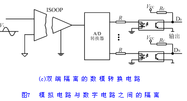 模擬電路與數(shù)字電路之間的隔離主要采用模/數(shù)轉換裝置;對于要求較高的電路,除采用模/數(shù)轉換裝置外,還應在模/數(shù)轉換裝置的兩端分別加入模擬隔離元器件和數(shù)字隔離元器件。