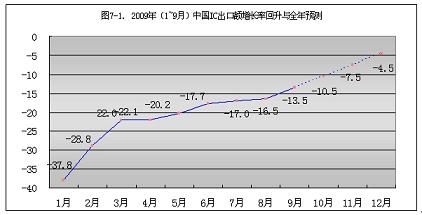 2009年1~9月份,中國(guó)大陸IC出口額的增長(zhǎng)率從元月份的-37.8%,回升到9月份的-13.5%?;厣?4.3個(gè)百分點(diǎn)。按此回升速度計(jì)算,到今年年底,可回升到-4.5%(見(jiàn)圖7-1)。