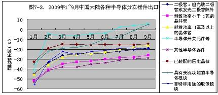 2009年1~9月份,中國(guó)大陸半導(dǎo)體分立器件出口額增長(zhǎng)率從元月份的-43.4%,回升到9月份的-37.7%。只回升了5.7個(gè)百分點(diǎn)。按此回升速度計(jì)算,到今年年底,只能回升到-35.5%,預(yù)計(jì)2010年會(huì)有所好轉(zhuǎn)(見(jiàn)圖7-2)。