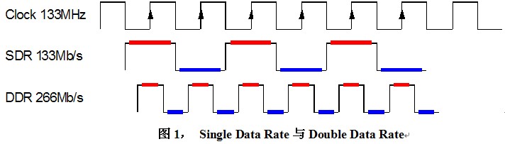 內(nèi)存技術(shù)從SDR,DDR,DDR2,DDR3一路發(fā)展而來,傳輸速度以指數(shù)遞增,除了晶圓制造工藝的提升因素之外,還因?yàn)椴捎昧薉ouble Data Rate以及Prefetch兩項(xiàng)技術(shù)。實(shí)際上,無論是SDR還是DDR或DDR2、3,內(nèi)存芯片內(nèi)部的核心時(shí)鐘基本上是保持一致的,都是100MHz到200MHz(某些廠商生產(chǎn)的超頻內(nèi)存除外)。DDR即Double Data Rate技術(shù)使數(shù)據(jù)傳輸速度較SDR提升了一倍。如下圖所示,SDR僅在時(shí)鐘的上升沿傳輸數(shù)據(jù),而DDR在時(shí)鐘信號上、下沿同時(shí)傳輸數(shù)據(jù)。例如同為133MHz時(shí)鐘,DDR卻可以達(dá)到266Mb/s的數(shù)傳速度。