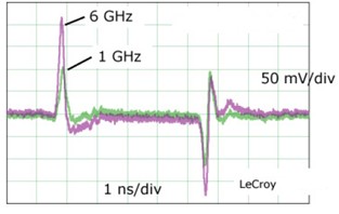 隨著脈沖信號上升沿的加快,信號所包含的諧波成分也越來越豐富。對于同一個脈沖信號,使用不同帶寬的示波器所測量出的結果可能是不同的。例如,下圖一所示的脈沖測量中,使用1G帶寬的示波器測量到的脈沖幅度僅為使用6G示波器測量值的一半。