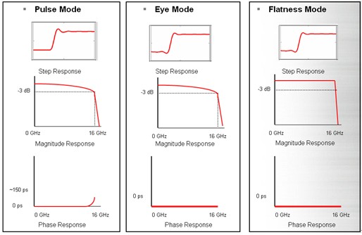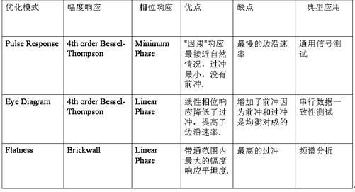 如圖五所示,每種脈沖響應方式均由不同的幅頻響應及相頻響應方式組合而來,對同樣的階躍脈沖信號,不同的響應方式將恢復出不同的信號波形。例如,采用Pulse Mode恢復出的波形與模擬示波器的測量效果最為接近,因為其采用的幅頻響應更為平緩,同時其相頻響應也是因果有界的;采用Flatness Mode恢復出的波形其上升時間最短,但波形中同時包含了更多的過沖成分。這三種脈沖響應方式不存在哪個更好的問題,而是分別適應了不同信號的測試應用需求。下表總結了三種脈沖響應方式的不同特點及其各自適用的領域。