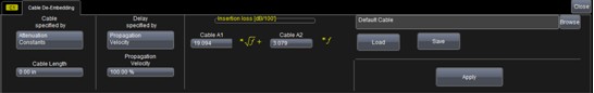 在使用示波器結合同軸電纜測量脈沖信號時,為保證測量的精確性與一致性,必須去除電纜的效應。力科WaveMaster8Zi系列示波器擁有電纜去嵌(cable de-embedding)功能,在每個通道中均可選擇是否激活此功能(下圖所示為cable de-embedding的操作界面)??梢允褂脙煞N方法來輸入電纜的特性:一種是電纜的衰減常數(shù),包括了電纜長度、傳輸速度、插入損耗的多項式系數(shù);另一種是直接輸入多個頻率點的插入損耗(即S參數(shù)的S21)。電纜的特性參數(shù)可以從電纜廠商處獲得,或者使用TDR或矢量網絡分析儀測量。