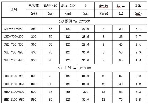 由于三相橋式整流器的電容器濾波實際上是直流支撐、DC-Link或直流母線旁路電容器。這樣問題關(guān)鍵就是“濾波”電容器的電流承受能力是否滿足要求。薄膜電容器制造商已經(jīng)制造出相應(yīng)的金屬化聚丙烯薄膜電容器。EACO的SHD系列DC-Link單面金屬化聚丙烯薄膜電容器的數(shù)據(jù)如表1所示。