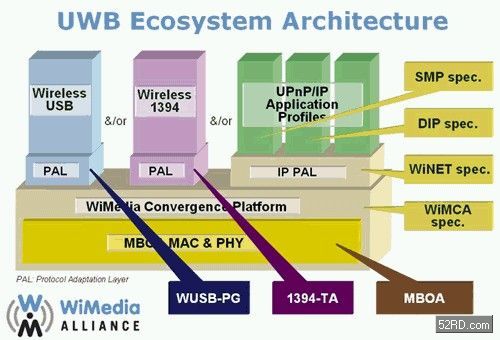 Wireless USB 1.0標(biāo)準是在2005年5月12日正式發(fā)佈,它的實體層(PHY Layer)、媒控層(MAC Layer)是使用MBOA組織所訂立的超寬頻(UWB)技術(shù),在PHY層、MAC層之上再搭建一層WiMEDIA Alliance所訂立的聚合層(Convergence Layer,IEEE 802.15.3a),在聚合層之上再依據(jù)不同的無線傳輸應(yīng)用而訂立不同的協(xié)定因應(yīng)層(Protocol Adaptation Layer;PAL),最后才將WUSB的通信建立于最上端,如此使WUSB運作。(附註:MBOA(Multi-Band OFDM Alliance)于2005年3月與WiMEDIA Alliance合併。)