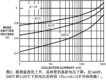 熱與冷都會(huì)對(duì)電路造成負(fù)面影響。在極高溫下,芯片可能燒毀(圖1)。更常見(jiàn)的情況是,如果你的設(shè)計(jì)達(dá)到未曾預(yù)料的溫度,很多部件都可能超出規(guī)定極限。當(dāng)出現(xiàn)這種情況時(shí),電路就可能表現(xiàn)出難以預(yù)料的行為。另外一個(gè)情況也同樣值得關(guān)注,即電路溫度從熱到冷,然后又從冷到熱。這種狀況會(huì)造成熱沖擊,也會(huì)毀壞元件。很多工程師并不關(guān)心自己的電路在低溫下的性能,但這種忽視是一個(gè)錯(cuò)誤。半導(dǎo)體器件的性能在低溫下會(huì)發(fā)生顯著變化。雙極晶體管的基射結(jié)電壓在低溫下會(huì)大大升高(圖2和參考文獻(xiàn)1)。AnalogDevices產(chǎn)品開(kāi)發(fā)工程經(jīng)理FranciscoSantos說(shuō):“如果你要設(shè)計(jì)一個(gè)能夠在負(fù)溫度下工作于1.8V的放大器,就要考慮當(dāng)從室溫降到-40℃時(shí),VBE(基射電壓)會(huì)增加130mV。這種情況將迫使設(shè)計(jì)者采用一組完全不同的放大器架構(gòu)。”