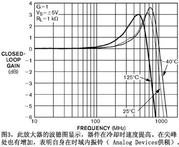 很多放大器,如AnalogDevices的AD8045,在冷卻時(shí)會(huì)加速(圖3),而有些放大器(如AD8099)則在變冷時(shí)會(huì)降速。已退休的LinearTechnology信號(hào)處理產(chǎn)品前副總裁兼總經(jīng)理BillGross稱:“雙極晶體管在低溫下遇到的多數(shù)麻煩是低電壓工作。”他認(rèn)為,較高的基射電壓和較小的電流增益都更難于滿足規(guī)格要求。他說(shuō):“較低的輸入阻抗和b(電流增益)的不匹配都會(huì)造成低溫下的大問(wèn)題。尤其是當(dāng)它們?yōu)槭覝剡\(yùn)行作了調(diào)整時(shí)。較高的gm(跨導(dǎo))很容易通過(guò)改變工作電流而得到補(bǔ)償,但這樣的話轉(zhuǎn)換速率就會(huì)變化。”
