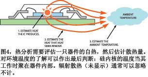 電路的熱分析分三個(gè)步驟。首先估計(jì)IC中產(chǎn)生的熱量。然后,估計(jì)電路板或散熱片散掉的熱量。最后,估計(jì)部件將要運(yùn)行的環(huán)境溫度(圖4)。在估計(jì)元件產(chǎn)生的熱量時(shí),DC分析通常沒(méi)什么價(jià)值。一只電壓為1V、流過(guò)1A電流的電阻器,會(huì)產(chǎn)生1W的熱量。但是,要估計(jì)交流或未確定的信號(hào)所產(chǎn)生的熱量就比較麻煩。首先,從電源端到接地腳的靜態(tài)電流總是在耗散一個(gè)直流功率。一個(gè)采用10V電源和5mA靜態(tài)