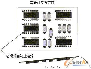 PCB上元器件的布局對(duì)生產(chǎn)效率和成本有相當(dāng)重要的影響,是衡量PCB設(shè)計(jì)的可裝聯(lián)性的重要指標(biāo)。一般來(lái)講,元器件盡可能均勻地、有規(guī)則地、整齊排列,并按相同方向、極性分布排列。有規(guī)則的排列方便檢查,有利于提高貼片/插件速度,均勻分布利于散熱和焊接工藝的優(yōu)化。另一方面,為簡(jiǎn)化工藝流程,PCB設(shè)計(jì)者始終都要清楚,在PCB的任一面,只能采用回流焊接和波峰焊接中的一種群焊工藝。這點(diǎn)在組裝密度較大、PCB的焊接面必須分布較多貼片元器件時(shí),尤其值得注意。設(shè)計(jì)者要考慮對(duì)焊接面上的貼裝元件使用何種群焊工藝,最為優(yōu)選的是使用貼片固化后的波峰焊工藝,可以同時(shí)對(duì)元件面上的穿孔器件的引腳進(jìn)行焊接;但波峰焊接貼片元件有相對(duì)嚴(yán)格的約束,只能焊接0603及以上尺寸的片式阻容﹑SOT﹑SOIC(引腳間距≥1mm且高度小于2.0mm)。分布在焊接面的元器件,引腳的方向宜垂直于波峰焊接時(shí)PCB的傳送方向,以保證元器件兩邊的焊端或引線同時(shí)被浸焊,相鄰元件間的排列次序和間距也應(yīng)滿足波峰焊接的要求以避免“遮蔽效應(yīng)”,如圖1。當(dāng)采用波峰焊接SOIC等多腳元件時(shí),應(yīng)于錫流方向最后兩個(gè)(每邊各1)焊腳處設(shè)置竊錫焊盤,防止連焊。