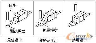 圖6所示為測(cè)試點(diǎn)設(shè)計(jì)的一個(gè)示例。通過(guò)延伸線在元器件引線附近設(shè)置測(cè)試焊盤或利用過(guò)孔焊盤測(cè)試節(jié)點(diǎn),測(cè)試節(jié)點(diǎn)嚴(yán)禁選在元器件的焊點(diǎn)上,這種測(cè)試可能使虛焊節(jié)點(diǎn)在探針壓力作用下擠壓到理想位置,從而使虛焊故障被掩蓋,發(fā)生所謂的“故障遮蔽效應(yīng)”。由于探針因定位誤差引起的偏晃,可能使探針直接作用于元器件的端點(diǎn)或引腳上而造成元器件損壞。