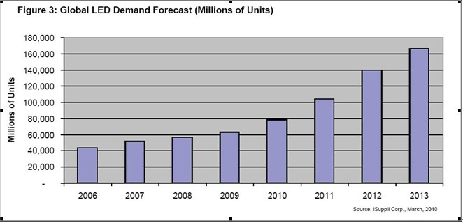 需求顯然超過了供給,而且LED市場至少在未來三年內(nèi)(包括2010年在內(nèi))將保持兩位數(shù)的增長速度,iSuppli公司預(yù)測今年可能出現(xiàn)嚴(yán)重供應(yīng)不足,除非增加額外產(chǎn)能來滿足日益增長的需求。