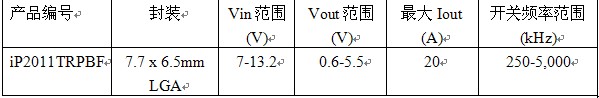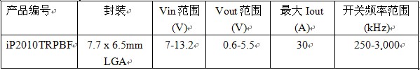 iP2010的輸入電壓范圍為7V至13.2V,輸出電壓范圍則為0.6V至5.5V,輸出電流高達(dá)30A。這個(gè)器件最高運(yùn)行頻率為3MHz。在5MHz運(yùn)行時(shí),與iP2010引腳兼容的iP2011備有相同的輸入和輸出電壓范圍,但后者經(jīng)過(guò)優(yōu)化,從而使最高輸出電流高達(dá)20A。通過(guò)以通用占位面積提供多種電流額定值器件,IR提供的靈活性能夠滿(mǎn)足不同客戶(hù)對(duì)電流水平、性能和成本的要求。