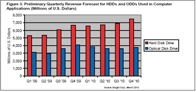據(jù)iSuppli公司,繼2009年下滑之后,預(yù)計(jì)2010年用于電腦的硬盤(pán)(HDD)和光驅(qū)(ODD)全球營(yíng)業(yè)收入將增長(zhǎng),因?yàn)镻C出貨量將隨著全球經(jīng)濟(jì)復(fù)蘇而上升。