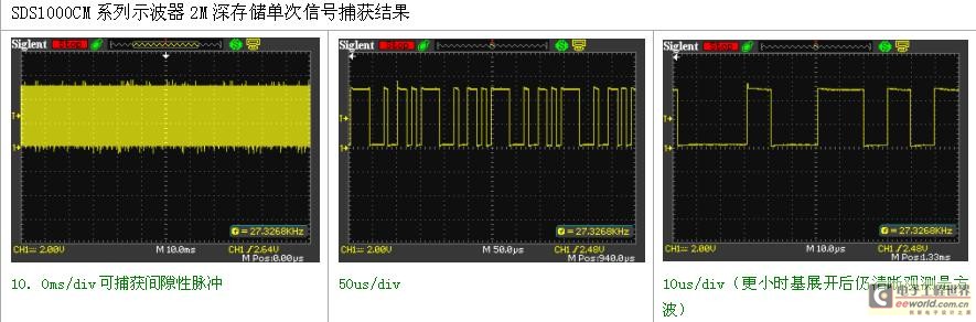 提高示波器的存儲深度可以間接提高示波器的采樣率。以一臺采樣率為1Gsa/s、存儲深度為20K的示波器為例來說,只要水平掃描速度在20ns/div以上時基,采樣速度就會急速下降。因為當(dāng)需要測量較長時間的信號波形時,必然要求大的時基檔位,這就造成采樣率的下降,采樣率的下降可能會遺漏信號的細(xì)節(jié)勢必造成信號波形質(zhì)量的下降。這時候就需要大的存儲深度來維持更高的采樣率來采樣測量。長存儲在保證獲取不失真的波形的同時又可以觀察更長時間的信號。