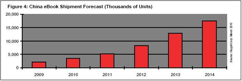 據(jù)iSuppli公司,2010年中國市場的電子書出貨量將達(dá)到360萬個,比2009年的210萬大增70.7%。到2014年,中國市場的電子書出貨量將達(dá)到1760萬個。