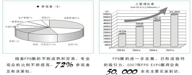 ●“光電平板顯示展”將吸引知名FPD企業(yè)的高管(日立、夏普、三星、LG、友達、華映等)、通路商的高管、政府要員、技術人員等近五萬人到場,同時組委會將通過國內外相關行業(yè)協(xié)會、商會組織專業(yè)士參觀。