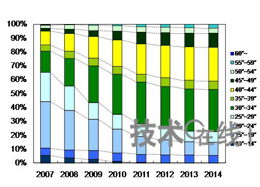 按屏幕尺寸劃分的電視供貨量展望(2010年以后為預(yù)測值)