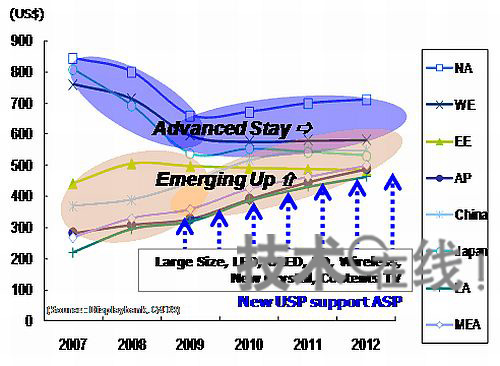 【4】分地區(qū)電視平均銷售價格展望 分地區(qū)看電視的平均銷售價格(ASP)變化可預(yù)測,發(fā)達國家市場的ASP暴跌將告一段落,而在新興市場國家,隨著FPD電視的增加和屏幕大型化,ASP將會繼續(xù)上漲。另外,估計LED背照燈液晶電視、3D電視、IPTV及無線功能等的普及也會成為推高ASP的因素。