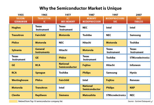晶體管的領(lǐng)導(dǎo)者。在1960年代, 能夠維持增長并領(lǐng)先是依靠雙極型集成電路技術(shù), 在該10年中, 排在前10名中的公司有40%消失, 而到1970年代,其中的80%也消失了。在70年代時(shí), 是依靠MOS存儲器來推動(dòng)增長, 當(dāng)時(shí)日本有三家公司,NEC,Hitachi及Toshiba進(jìn)入前10。到1980及1990年代, 排在首位是依靠微處理器, 如英特爾與Motorola。在1990年代, 情況有所變化, SoC的領(lǐng)導(dǎo)者, 如STMicroelectronics及TI進(jìn)入前10。而到最近10年中,fabless公司如Qualcomm及代工大亨TSMC進(jìn)入前10中。