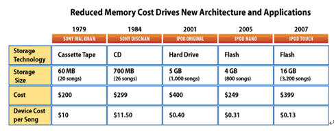在如此高的累積數(shù)量增長下推動(dòng)學(xué)習(xí)曲線的成本下降,在過去10年中每年晶體管的成本下降35%及總體上能使新的應(yīng)用市場達(dá)到規(guī)模化。如2001年的MP3播放機(jī)的價(jià)格與今天的攝像機(jī)相同, 而今天攝像機(jī)中用的存儲器容量增長了10倍, 而且與2001年時(shí)的尺寸及功耗幾乎相同。