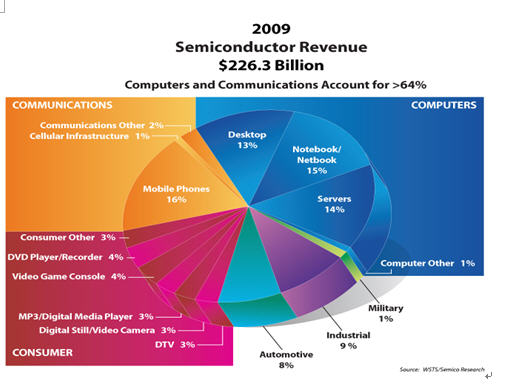 那么未來將會是怎么樣呢?只要晶體管的數(shù)量按目前的高增長倍率繼續(xù)走下去,各種新的應(yīng)用會層出不窮,推動(dòng)半導(dǎo)體市場總量進(jìn)一步提高。因此全球半導(dǎo)體市場在近15年來看似十分穩(wěn)定,雖然如臺式計(jì)算機(jī)市場已經(jīng)飽和,但是筆記本電腦和上網(wǎng)本開始流行,加上消費(fèi)類電子產(chǎn)品如游戲機(jī),平板電視,MP3, 數(shù)碼相機(jī)等, 由于半導(dǎo)體含量的增加推動(dòng)了半導(dǎo)體TAM的增加。