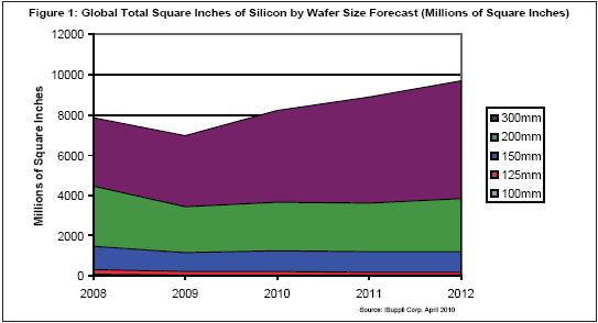 圖1所示為iSuppli公司對(duì)2008-2013年硅片面積總產(chǎn)量的預(yù)測(cè),按晶圓尺寸細(xì)分。