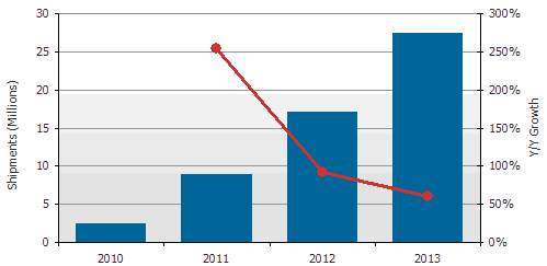 隨著主要電視品牌廠商開(kāi)始在商場(chǎng)銷(xiāo)售3D電視及有愈來(lái)愈多關(guān)于3D產(chǎn)品計(jì)劃的進(jìn)行,DisplaySearch將2010年3D電視出貨量提高到250萬(wàn)臺(tái),同時(shí)3年后3D電視市場(chǎng)將會(huì)有非常驚人的發(fā)展,預(yù)估到2013年將超過(guò)2千7百萬(wàn)臺(tái)出貨。圖一為2010到2013年間3D電視出貨量預(yù)測(cè)。
