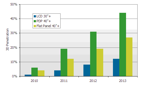 Paul指出3D電視剛開(kāi)始以大尺寸產(chǎn)品為主,同時(shí)需要結(jié)合如藍(lán)光DVD與3D數(shù)字廣播系統(tǒng)等才有機(jī)會(huì)引發(fā)消費(fèi)者購(gòu)買(mǎi),因此預(yù)估今年主要出貨將以北美市場(chǎng)為主,北美將占有全球超過(guò)50%出貨量。另外與其它機(jī)種比較,具備3D功能的影像處理器與增加顯示功能方案成本都非常昂貴,也因此3D市場(chǎng)成長(zhǎng)將受限于倍頻與雙倍頻機(jī)種的滲透率。DisplaySearch預(yù)估到了2013年3D電視占所有40寸及以上尺寸電視出貨量比率將僅有27%。除了成本因素外,西歐地區(qū)目前藍(lán)光DVD與高清播放系統(tǒng)滲透率仍低,如此一來(lái)對(duì)于3D內(nèi)容提供形成一定障礙,也對(duì)于3D電視成長(zhǎng)造成一些影響。