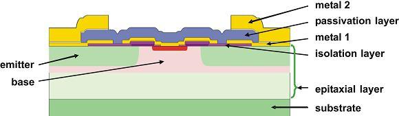 通過選擇不同的低電阻襯底,比如:圖1所示的摻磷/摻砷襯底,可以有效降低半導(dǎo)體中的電壓降比例。另一個重要的影響因素是電流分配,應(yīng)在整個芯片范圍內(nèi)盡可能保持均衡,將芯片前端金屬化擴(kuò)展電阻降至最低。對于BISS晶體管,芯片中的均衡電流分配通過一種稱為網(wǎng)格技術(shù)的手段來實現(xiàn)——將晶體管分成不同的格柵結(jié)構(gòu)。第四代BISS晶體管采用受專利保護(hù)的雙層金屬化布局,能夠最大程度提升發(fā)射極線路金屬厚度,降低飽和電阻(參見圖2)。