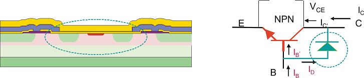要在降低飽和電壓的基礎(chǔ)上縮短開關(guān)時間,關(guān)鍵是最大程度降低開關(guān)操作中晶體管的擴(kuò)展電容。這主要通過集成寄生的鉗位結(jié)構(gòu)(圖3)來實現(xiàn),該設(shè)計可以避免過驅(qū)動處于飽和狀態(tài)的晶體管,能夠有效降低晶體管的存儲時間ts。