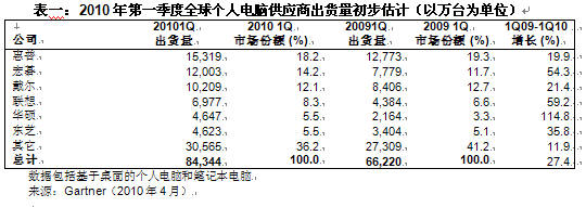 據(jù)Gartner發(fā)布的初步統(tǒng)計結(jié)果,2010年第一季度全球個人電腦出貨量已達到8,430萬臺,與2009年同期相比增長27.4%,這一結(jié)果超過了Gartner此前所作的22%的增長預(yù)測。