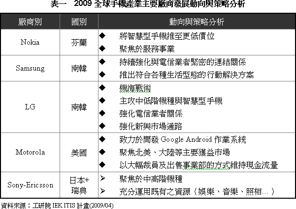 受金融風(fēng)暴影響,2009年全球手機(jī)市場(chǎng)衰退已成定局,為了因應(yīng)詭譎多變的局勢(shì),前五大手機(jī)品牌業(yè)者紛紛調(diào)整其市場(chǎng)策略,Nokia以完整布局求穩(wěn)定發(fā)展,Motorola與Sony-Ercisson則主要以撙節(jié)開(kāi)銷的方式熬過(guò)寒冬,相較之下韓系業(yè)者則以較為積極的方式進(jìn)行布局。