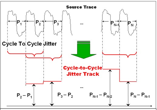 相鄰周期抖動(dòng)(Cycle to cycle jitter)是時(shí)鐘相鄰周期的周期差值進(jìn)行統(tǒng)計(jì)與測量的結(jié)果。如圖4所示,后一時(shí)鐘周期減去前一時(shí)鐘后作為統(tǒng)計(jì)的樣本,C1=P2-P1, C2=P3-P2, Cn-1 = Pn - Pn-1,把C1到Cn-1進(jìn)行數(shù)理統(tǒng)計(jì),同理,可以計(jì)算出Cycle to cycle jitter的峰峰值和RMS值。