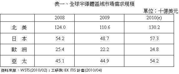 2009年全球半導體市場僅北美地區(qū)微幅成長1.7%,其他皆呈現(xiàn)負成長:亞太市場衰退3.5%,歐洲市場衰退21.9%,日本市場衰退21.0%。不景氣使得下游電子產(chǎn)品品牌大廠,如Dell、HP、Sony等廠商增加產(chǎn)品委外代工之比例,以降低生產(chǎn)成本,增加其產(chǎn)品競爭力。因此,2009年主要從事代工生產(chǎn)之亞太地區(qū),才會出現(xiàn)僅小幅衰退之情形。至于北美地區(qū)則是因為受到下游品牌廠商降價促銷成功,使得市場呈現(xiàn)小幅成長。
