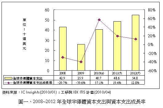 金融風暴使得全球廠商皆大幅減少資本支出金額,以保存手中之現(xiàn)金,度過此波不景氣。 2009年全球半導體資本支出為259億美元,較2008年429億衰退39.6%。然而,在看好今年歐美主要消費市場需求之復蘇,以及新興市場需求力道可望持續(xù)下,2010年全球半導體廠商將提高資本支出達407億美元規(guī)模,較2009年大幅成長57.1%。其中,全球記憶體廠商大幅提高資本支出,以提升其先進制程水準,是主要動力之一。