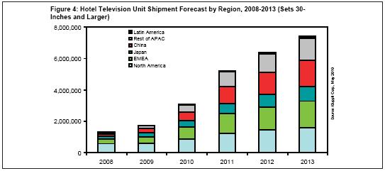 預計2013年酒店電視出貨量將從2009年的170萬臺增長到740萬臺(譯者注:從此處看,是增長“近四倍”),復合年度增長率為55%。此處出貨量是指尺寸大于或等于30英寸的酒店客房電視出貨量。