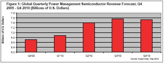 2010年第一季度,電源管理半導(dǎo)體銷售收入達(dá)到69億美元,比2009年第四季度的67億美元增長2.9%。該市場在2009年第三季度曾陷入停滯,第四季度開始擴(kuò)張,第一季度數(shù)據(jù)顯示該市場仍在擴(kuò)張。