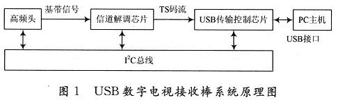 USB數(shù)字電視接收棒系統(tǒng)主要有以下4個模塊構(gòu)成,如圖1為系統(tǒng)的原理圖。