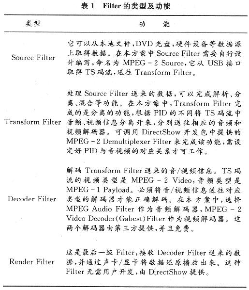 軟件方面,PC機端應用程序的核心部分是實時播放器,需要播放的是TS碼流,這是MPEG-2標準定義的一種碼流。本方案采用基于DirectShow技術(shù)搭建的媒體播放器。DirectShow是DirectX家族中的成員,它為在Windows平臺上處理各種格式的多媒體文件的回放、音視頻采集等高性能要求的多媒體應用提供了完整的解決方案,重要的是它很好地支持了MPEG-2標準,它使應用程序開發(fā)人員從復雜的數(shù)據(jù)傳輸、硬件差異、同步性等工作解脫出來,總體應用框架和底層工作由DirectShow來完成,大大加快了開發(fā)進度。
