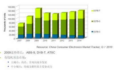 STB 2009年逆勢增長。大城市發(fā)展方向是高清和雙向機頂盒;中小城市是STB的成長主力。