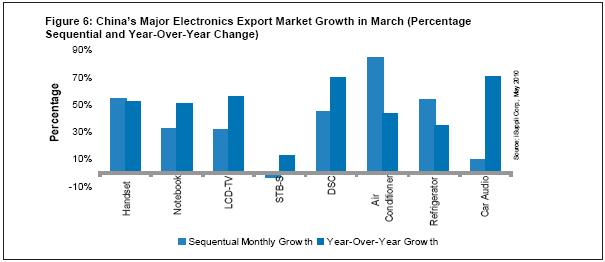 據(jù)iSuppli公司,3月份中國(guó)電子產(chǎn)品出口大幅增長(zhǎng),多數(shù)產(chǎn)品的環(huán)比和同比增長(zhǎng)速度均達(dá)到了兩位數(shù)。