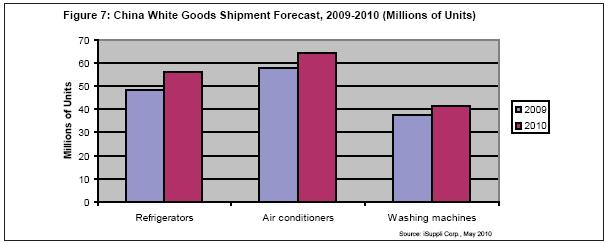 圖7所示為2009和2010年上述三大白色家電的中國(guó)市場(chǎng)出貨量預(yù)測(cè)。