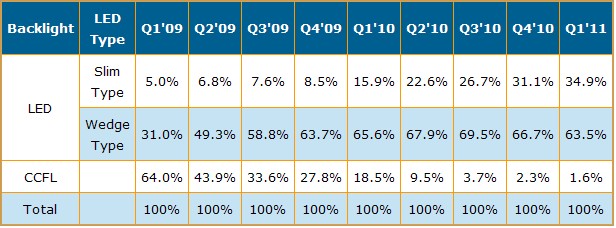 裝載薄型導(dǎo)光板之薄型LED Backlight在筆記本電腦面板市場(chǎng)正快速成長。根據(jù)DisplaySearch最新的Quarterly LED Backlight Panel Shipment and Forecast Report (每季LED Backlight面板出貨與預(yù)測(cè)報(bào)告)中指出,筆記本電腦使用的面板當(dāng)中,薄型LED Backlight的比重將由2010年第四季的16%成長到2010年的31%。報(bào)告并指出,LED Backlight在筆記本電腦面板的滲透率由2009年第一季的36%擴(kuò)大到2010年第一季的81.5%,展望到今年年底預(yù)計(jì)滲透率將高達(dá)97.7%;換言之傳統(tǒng)的CCFL Backlight在Notebook PC市場(chǎng)將接近完全退出的狀態(tài)。
