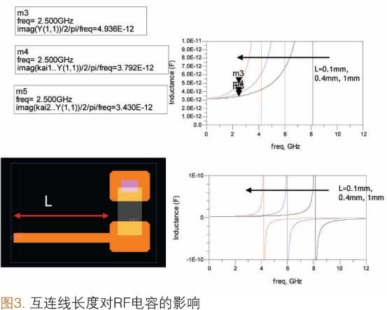 圖3是RF頻段下單個(gè)SMD焊盤的互連線長度對(duì)電容影響的簡單實(shí)例。在這種情況下,3.0pFSMD電容的一個(gè)電極連接在M2層上,形成接地電容。100.0μm寬的互連線與另一個(gè)電極連接在一起。在2.5GHz頻段下,1.0mm長的互連線可使SMD電容器的等效電容增長到4.9pF(增大了63%)。當(dāng)然,互連線越短,等效電容與本征電容(3.0pF)的值就越接近。然而,通常使用長互連線連接SMD元件是不可避免的。在這種情況下,考慮互連線對(duì)電容的影響就顯得異常重要(有時(shí)把這種方法稱為對(duì)電容的微調(diào)),否則SiP將無法正常工作。
