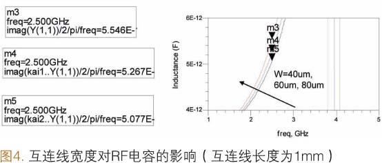 [page]除互連線長度之外,互連線的寬度也會(huì)對(duì)RF電容產(chǎn)生影響。在襯底的制作過程中,線寬通常會(huì)發(fā)生變化(舉例來說,與設(shè)計(jì)寬度相比,實(shí)際線寬的變化范圍為±10.0μm~±15.0μm)。如圖4所示,如果設(shè)計(jì)的互連線為1.0mm長,60.0μm寬,實(shí)際卻達(dá)到40.0μm寬,在2.5GHz下等效電容變化將達(dá)到5.3%(以3.0pF接地SMD電容為例)。如果把這種SMD電容用于濾波器中,對(duì)于RF應(yīng)用來說,電容值5.3%的變化將導(dǎo)致約2.7%的頻移。我們必須對(duì)RF應(yīng)用中含有SMD電容的RFSiP模塊的襯底制造容差進(jìn)行細(xì)致研究。