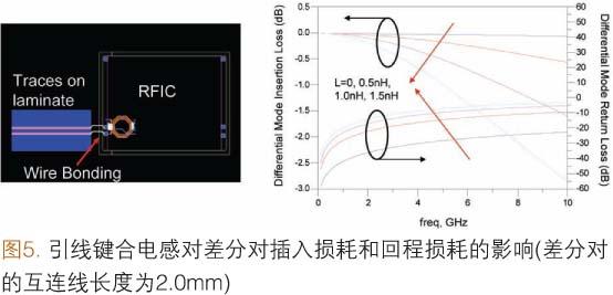 圖5顯示了鍵合引線電感是如何影響差分對(duì)連線的插入損耗的。在實(shí)例中,100.0Ω差分對(duì)的長度為2.0mm。假設(shè)差分對(duì)的一端使用引線鍵合方式與RFIC連接,并把直接與引線長度相關(guān)的電感(L)設(shè)為可變值。正像回程損耗曲線圖表示的那樣,加上引線鍵合電感可使差分對(duì)偏離100.0Ω這一匹配條件,結(jié)果使插入損耗增大。在5.0GHz下,0.5nH、1.0nH和1.5nH引線電感的插入損耗分別為0.2dB、0.5dB和1.2dB。即使達(dá)到極高的頻率,疊層上的差分對(duì)本身仍具有良好的阻抗匹配特性。