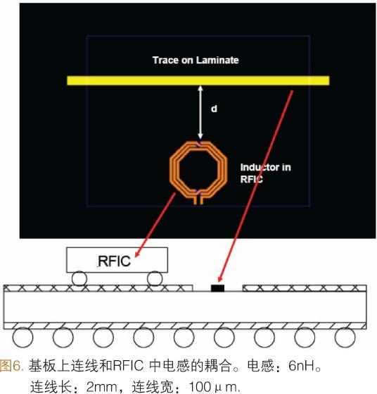 為了對(duì)主時(shí)鐘線和RF元件之間的相互作用進(jìn)行分析,把壓控振蕩器(VCO)中使用的RF電感(6.0nH)放置在穿通多層襯底的時(shí)鐘互連線附近(圖6)。我們?cè)谶@個(gè)研究中使用的互連線長為2.0mm。當(dāng)VCO電感和互連線之間的橫向距離(d)大于0.5mm時(shí),產(chǎn)生的耦合信號(hào)將小于-80.0dB。耦合信號(hào)的實(shí)際要求由SiP系統(tǒng)級(jí)電設(shè)計(jì)決定。