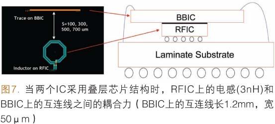 圖7給出了BBIC和RFIC采用SiP(為簡單起見,實(shí)例中未表示SMD元件)疊層芯片結(jié)構(gòu)的實(shí)例。在這個(gè)實(shí)例中未使用金屬屏蔽層,使用環(huán)氧芯片粘接材料把BBIC直接堆疊在RFIC上。就像前文提到的那樣,BBIC中的主時(shí)鐘信號(hào)(20.0MHz或40.0MHz)包含一些高頻成分,落在RF芯片通帶的范圍內(nèi)。如果BBIC中時(shí)鐘互連線和RF芯片之間沒有保持足夠的隔離,特別是在VCO電感中,主時(shí)鐘信號(hào)可能使RF電路產(chǎn)生噪聲,降低RF芯片的選擇性。