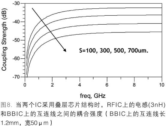 圖8表示了BBIC和RFIC電感之間的耦合強(qiáng)度(未使用隔離層)。假設(shè)BBIC和RFIC的厚度為250.0μm時(shí),對(duì)VCO電路中的3nH電感進(jìn)行了研究。BBIC中主時(shí)鐘的互連線設(shè)置為1.2mm長。根據(jù)模擬結(jié)果,當(dāng)橫向距離(S)為100.0μm時(shí),2.5GHz下的隔離為-35dB。這一隔離值對(duì)大多數(shù)RF應(yīng)用來說是不夠的。當(dāng)橫向距離為700.0μm時(shí),隔離值提高為-50dB,這個(gè)值對(duì)大多數(shù)RF應(yīng)用來說仍然不夠。為保證VCO電感的性能,位于BBIC電感上方的主時(shí)鐘不能使用長互連線。根據(jù)以上分析,我們還應(yīng)對(duì)RFSiP使用的疊層芯片法做進(jìn)一步研究,從而判斷BBIC和RFIC器件之間出現(xiàn)嚴(yán)重相互干擾的可能性。